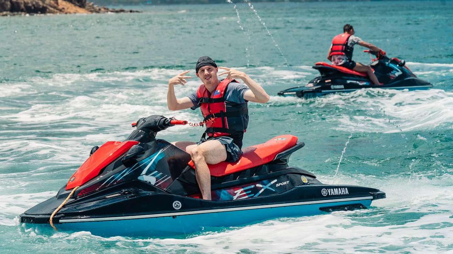 Pour clore cette immersion, Palmer a profité d’une promenade en jet ski, affichant un large sourire en filant sur la mer des Caraïbes — détendu, chez lui et visiblement ravi de chaque instant passé.